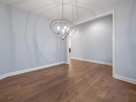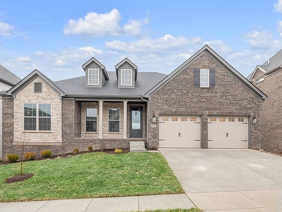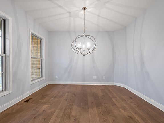 The Atkinson on an unfinished walk out basement. The Atkinson is a spacious ranch plan with three bedrooms, The main living areas, including a flex area, share an open layout with 10' ceilings. The kitchen has an island with counter dining, spacious pantry, and breakfast area with multiple windows. A hallway with coat closet drop zone, plus powder room, connects the kitchen to the garage. The family room overlooks a large covered patio with direct vent fireplace. The primary bedroom is located off a semi-private hall and has a trey ceiling and triple window. A luxury bath with separate vanities, a separate shower and garden tub, linen closet, and an oversized walk in closet complete the suite. Bedrooms two and three share a hall bath, and there is a spacious utility room with folding counter. Exterior details include a covered front porch, dormers, separate garage doors, and hip roof.
