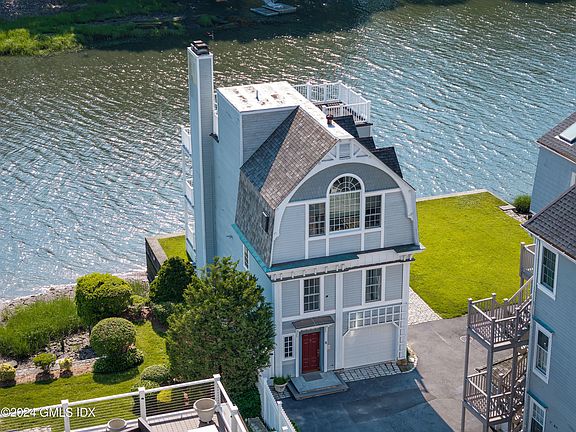Exquisite waterfront living on Steamboat Road! Be astounded by the breathtaking views of Long Island Sound from every room. Free-standing townhouse sited in a neighborhood w/stunning homes. A short walk to downtown Greenwich, this elegantly renovated unit boasts 3 bedrooms & 3.1 baths. Exceptional architectural elements & meticulous attention to detail, this graciously scaled interior is a constant delight. Features: hardwood floors, high ceilings, private ELEVATOR, fireplaces, built-ins & tall windows make the most of the water views. The gourmet kitchen opens to a dining area. Lovely primary with elegant marble bath. Finished loft (not included in SF) brings the total square footage to 2819. Bonuses: 4 expansive decks (2 covered), 2 garages & 3 additional parking spaces. Truly special.