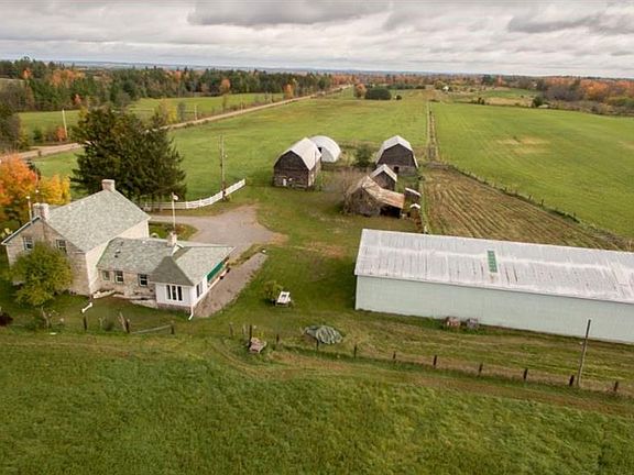 Breath taking 1846 stone home with attached garage located on approximately 45 acres, with 4 barns and a 46ft x 100ft machinery shop. This home features 4 bedrooms and a 3 piece bathroom upstairs and the main floor boasts a large and inviting formal living room area with dining room, a second sitting room, main floor laundry, full bathroom, spacious eat in kitchen and a newly renovated sunroom. You can also enjoy your summer evenings on the sunporch. Among the property you have 40 acres of sandy-loam tillable land and approximately 5 acres of pasture with a wooded tree line along the back edge of the property which abuts the snowmobile trail at the southwest end of the land. This property has been meticulously maintained and pride of ownership is apparent throughout this home inside and out.