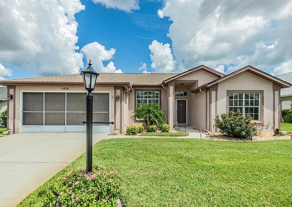 BEAUTIFUL 3 BEDROOM, 2 BATHROOM HOME WITH SPACIOUS ENCLOSED LANAI IN THE HIGHLY SOUGHT COMMUNITY OF TIMBER GREENS! This home has a wonderful split floor plan and has been very well maintained! The roof is 2019, HVAC is 2023, and H20 heater is 2024! The high vaulted ceilings are present in every room of this home! The 3rd bedroom and 2nd bathroom can be closed off by a slider door creating an ideal "guest quarters" space! The kitchen is open to the family room and boasts a double oven, flat top stove, breakfast bar, and eat-in kitchenette! The Primary Bed/Bathroom features two closets, dual vanity, garden tub, and shower stall! Walk through the back french doors into the relaxing climate controlled enclosed lanai! Other great features of this home include its Plantation shutters throughout entire home, and spacious laundry room with slop sink! ALL OF THIS IN THE BEAUTIFUL 55+ GOLF COURSE COMMUNITY OF TIMBER GREENS! Timber Greens amenities include its 18 hole golf course, clubhouse, community pool and spa, tennis courts, pro shop, restaurant and so much more! This one is priced to sell and won't last long. Set up your showing today!
