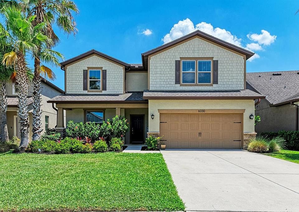 ASK ABOUT ASSUMABLE MORTGAGE AT 2.25% Welcome to this stunning 4 bedroom, 2.5 bathroom home that perfectly blends elegance and comfort. As you step onto the inviting front porch, you'll immediately feel at home. The heart of the home is the gourmet kitchen, which boasts a large island, granite countertops, a stylish tile backsplash, and pendant lighting. Stainless steel appliances make this kitchen a chef’s dream, and the open layout seamlessly connects it to the spacious great room—perfect for entertaining or family gatherings. Retreat to the master bedroom, which offers a ensuite bathroom complete with granite countertops, dual sinks, a walk-in tiled shower, and a separate water closet for added privacy. The kitchen, great room and master bedroom all come with crown molding. On the lower level, you’ll find a versatile den with double doors that can be used as a gym, office, or playroom or could possibly be converted to a 5th bedroom. Upstairs, a large bonus room provides additional space for recreation or relaxation, alongside three generously sized bedrooms and a full bathroom. The over-sized laundry room on the first floor is both functional and stylish, equipped with custom cabinets, plenty of countertop space, and a convenient sink. The garage features a 4-foot extension making it 24 ft long....perfect for larger vehicles, small boats or possibly a garage workshop. The garage also comes with built-in storage racks and an insulated garage door. Step outside to the fenced-in backyard, where you’ll find a peaceful patio with a pond view—an ideal spot for outdoor dining or simply unwinding after a long day. Luxury Community amenities include: Zero/Beach Entry Resort Style Pool with Cabanas, Covered Outdoor Entertaining Area, Splash Pad, Playground, 5600 Sq Foot Clubhouse, Clubhouse Manager, 24 Hour Fitness Center and Lakeside Walking/Jogging Trails. Along with all the amenities your fees include basic cable and internet as well as irrigation. Trevesta is conveniently located to all major highways providing quick and easy access to WORLD FAMOUS beaches, St. Petersburg, Tampa, Bradenton, Lakewood Ranch and Sarasota destinations. This home combines practical features with elegant finishes, making it the perfect place to create lasting memories. Don’t miss the opportunity to make this beautiful house your new home. Schedule a tour today!