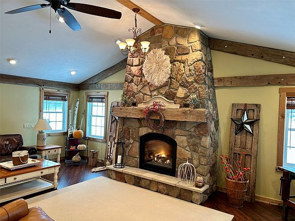 Enjoy peace and serenity in this well-maintained, updated and freshly painted home on a 1-acre, private, treed lot. Beautiful outdoor space includes both a maintenance free deck and patio with pergola. Behind the oversized garage, enjoy a 25 x 9 heated work space. Inside this beautiful home, all the windows are new and each room has its own mini split air conditioner with heat pump. Best of all is the fabulous family room with floor to ceiling stone fireplace and radiant heat in the floor. Country lovers will definitely LOVE this house!
