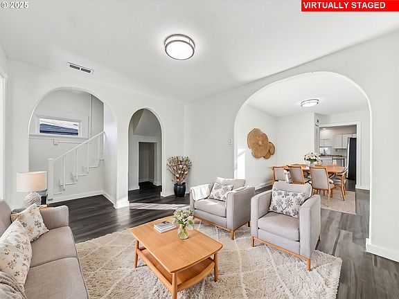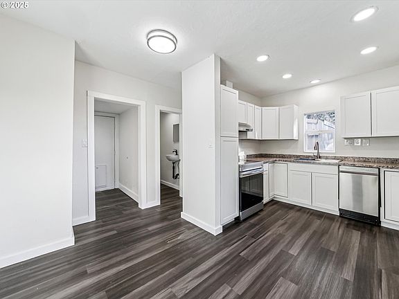 Adorable, affordable remodeled home in Lents! This home is light and bright with archways, new kitchen, new flooring, fresh paint, 2 bedrooms, 1.5 bathrooms on the main with a nonconforming 3rd bedroom upstairs. Nice covered patio off the dining room and a fully fenced yard with a long driveway and a huge detached garage/workshop. Great walkable area close to food carts, shops, Glenwood City Park and Mt Scott Park. [Home Energy Score = 2. HES Report at https://rpt.greenbuildingregistry.com/hes/OR10235150]