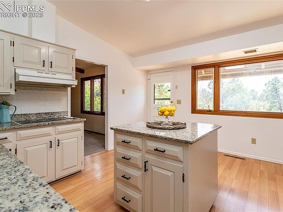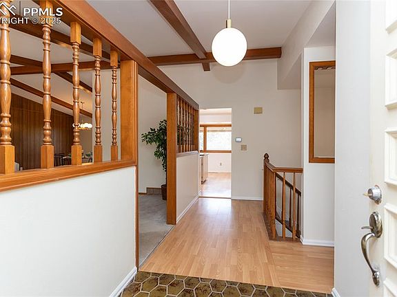 Located in the highly desirable Golden Hills community within the award-winning D-20 school district, this traditional raised ranch home offers rare privacy on a spacious half-acre flag lot—one of the largest in the neighborhood. Surrounded by mature trees and wildlife, the property provides a peaceful retreat while still offering quick access to I-25 and Woodmen Road for convenient commuting. The home features four bedrooms and three bathrooms, with recent updates including fresh interior paint, an A/C system, and fully redone front and rear decks. The spacious kitchen is equipped with granite countertops, stainless steel appliances, double ovens and ample cabinetry. Unique wood beams and a fireplace add warmth and character to the main living area. The included appliances—refrigerator, dishwasher, washer, and dryer—offer added convenience. The expansive backyard backs up to the park. A rare four-car garage provides plenty of room for parking, storage, or a workshop. This property combines privacy, space, and location, presenting a unique opportunity to own a home in one of Colorado Springs' most sought-after neighborhoods.