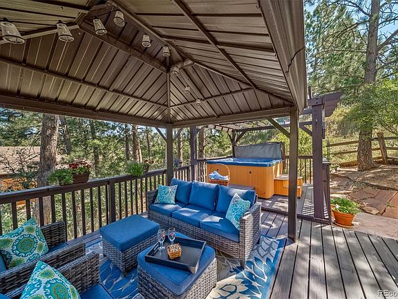 As you enter, you'll be greeted by a spacious living room featuring a cozy fireplace and multiple exits to a wrap-around deck and patio. This outdoor oasis is perfect for enjoying Colorado's sunny weather, complete with a built-in hot tub and a charming gazebo. The property offers natural privacy from the towering trees and stunning views of the mountains, even from the hot tub!