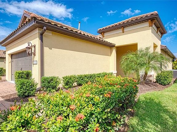 Gorgeous water views from this immaculate and gently lived in home at Villa Amalfi. A gated maintenance-free community in a convenient Sarasota location just minutes from SRQ Airport, dining, world-class shopping, pristine beaches, performing arts and so much more. The Tidewater floorplan offers 2 bedrooms, plus a den with double doors, an open kitchen and family room area with over 1500 sq feet. Some of the notable interior upgrades include lots of crown molding, plantation shutters with upper and lower tilt, power shade for the sliders in the living room, ceilings fans, comfort height toilets and a neutral color palette. There is NO carpet in this home and an added Halo UV system on the AC to reduce allergens. The extended lanai, with natural gas stub for future grill, is where you will spend a lot of time enjoying shimmering water views and simply spectacular sunrises. Villa Amalfi is a friendly, 92 villa community. Pay one monthly HOA fee which includes security gate, lawn and common area maintenance, exterior maintenance, community pool and pavilion, and reserves for exterior and roof maintenance. The perfect lock and leave lifestyle with the ease of one-level living. Time to enjoy an enviable Florida lifestyle in a wonderful location at a reasonable price with NO CDD fees. NOTE: if 2021 proposed budget is approved as expected, HOA fee will drop to $864.00 per quarter!