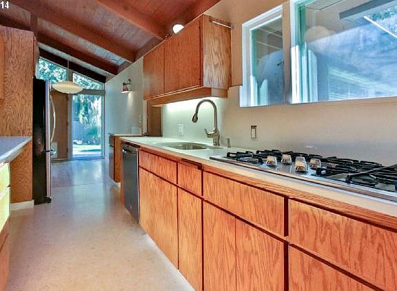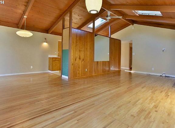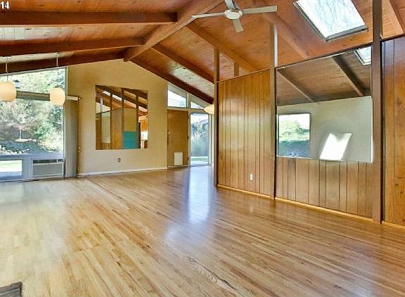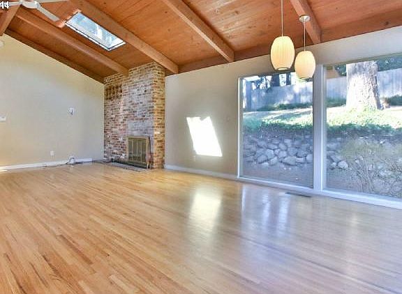Beautiful Mid-Century Modern w/Pacific NW Contemporary styling in sought after Maplewood area of SW Portland featuring hardwoods, vaulted wood ceilings w/beams, brick fireplace, kitchen w/new Caeserstone, stainless sink, faucet & appliances, cork floor & 5-burner gas stovetop, updated bathroom, new light fixtures, solartube, newer (2008) comp roof, huge gorgeous landscaped yard on over 1/3 acre, slate patio. Refrig & WD included.