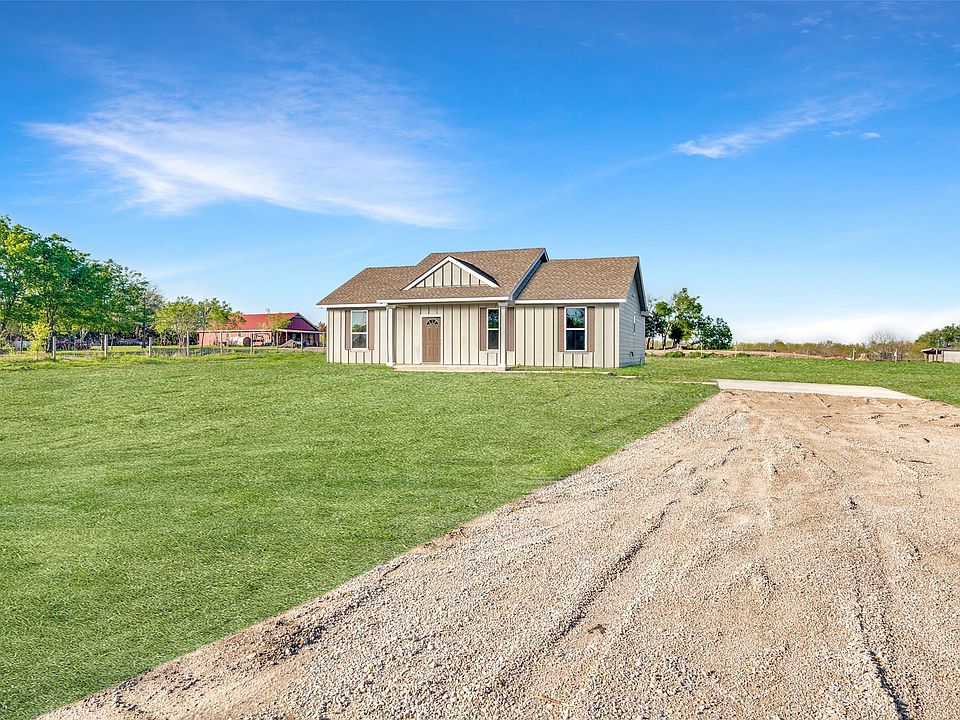 This Modern Farmhouse 3-Bedroom 2-Bath new build offers an ideal blend of aesthetics and practicality. The open concept floor plan, soaring vaulted ceiling with wood beam, and durable laminate wood floors offers both elegance and functionality. The light-filled kitchen offers a passthrough breakfast bar, designer faucet, quartz countertops, ceramic tile Backsplash, and stylish 42” upper cabinets. The Master Suite offers a private retreat, complete with an ensuite bath and tiled shower and tub combo. Situated on a spacious 1-acre homesite, the property offers endless possibilities for outdoor activities such as gardening, playing sports, or even adding a personal workshop. This energy efficient home includes spray foam insulation. The covered front porch & rear patio provide great views. This property is conveniently located just minutes from shopping & restaurants. Additionally, the absence of Homeowners Association (HOA) fees provides homeowners with greater flexibility & freedom.