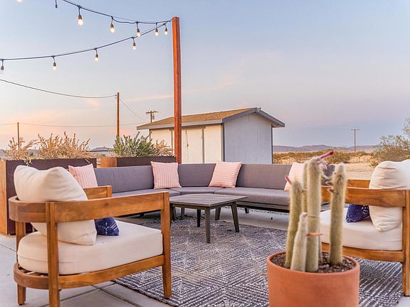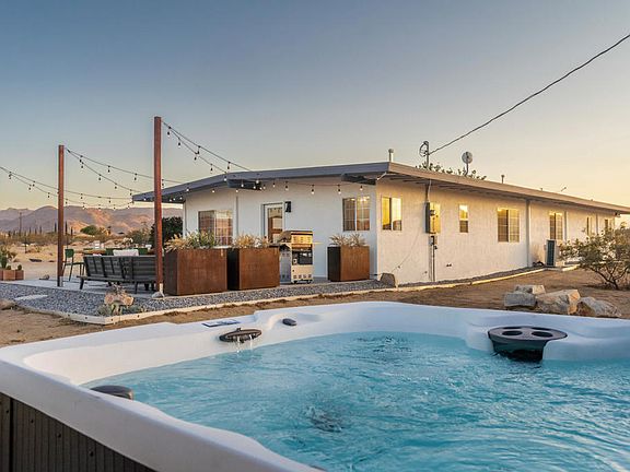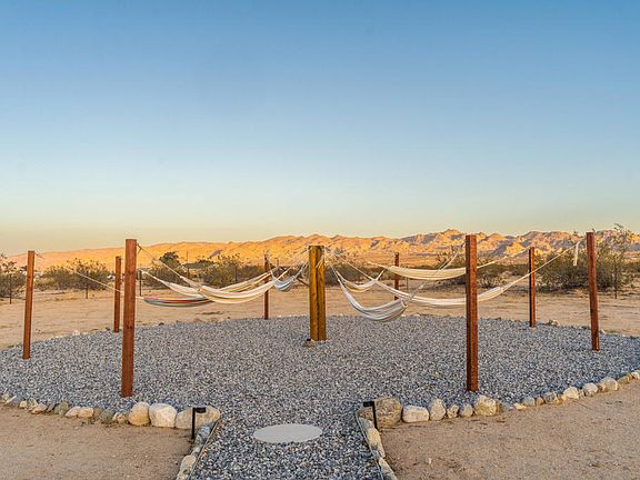Welcome to The Gold Nugget - Joshua Tree! This stunning turnkey retreat is ready for its next owner to enjoy. Nestled in the serene Sunfair area, this property offers the perfect blend of seclusion and convenience, just 10 minutes from downtown Joshua Tree.Set on a sprawling 2.5-acre corner lot, you'll be captivated by the breathtaking panoramic views and ultimate privacy. The outdoor spaces are designed for relaxation and entertainment, featuring a hot tub, bocce ball court, hammocks for lounging, and a cozy fire pit, perfect for unwinding under the desert sky. Inside, you'll discover a beautifully curated space featuring 4 bedrooms and 2 bathrooms, along with an open-concept kitchen and living area. Designed for both style and comfort, this inviting retreat offers plenty of room to host, relax, and unwind.Whether you're looking for a primary residence, vacation getaway, or investment opportunity, this property has it all.Come experience the magic of the Hi-Desert and see why Joshua Tree remains one of California's most sought-after destinations!