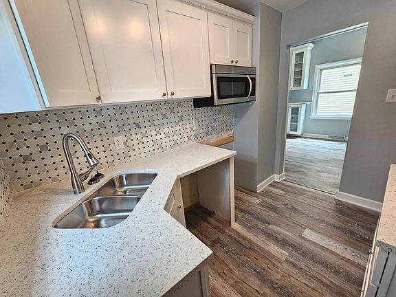 What a cutie! This 3 bedroom, 1 bathroom home has been totally remodeled. Interior has a neutral color ensemble. Home features a long living room with formal dining room that has built in china cabinets. Kitchen has sleek shaker cabinetry with granite counter tops, trendy back splash and stainless steel appliances. Updated bathroom with unique shower panel. Basement is freshly painted and has a partial crawl space. Property has a fenced yard and parking on side of the home.