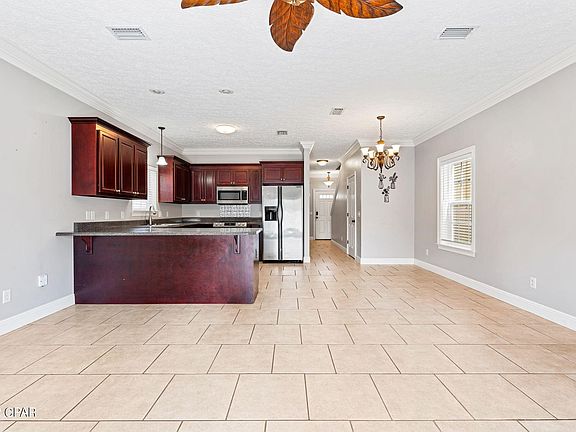 This affordable 3 bed, 2.5 bath house is only minutes to area beaches and Gulf of Mexico. The downstairs great room has 10' ceilings with crown molding and is open, spacious, and ideal for cozy intimate evenings or entertaining guests. The double doors open from the living area onto a wood deck and the back yard with privacy fenced backyard. The kitchen has stainless steel appliances, lots of cabinets, and a breakfast bar. Upstairs the master bedroom has double doors that open onto a balcony and a large walk-in closet. At the top of the stairs, you will find a reading/computer nook. This house is perfectly situated near the Navy base, Bay Point and St Andrews State Park. Thomas Drive is nearby with a variety of local grocery stores, restaurants, shopping, and entertainment.