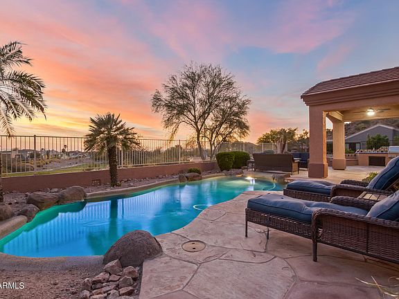 Welcome to your dream home in Red Mountain Ranch, Mesa! This stunning single-level residence is located on a rare golf course lot at the end of a cul-de-sac in the gated Red Mountain Ranch community. Enjoy breathtaking views of mountains, the golf course, city lights, and sunsets from this 3 BD/2 BA beauty. Entertaining is a breeze with the heated pool, spa, and outdoor kitchen. The vaulted ceilings add an airy feel, and the master bedroom offers ample space without sacrificing comfort. Recent exterior paint adds a fresh touch, and the oversized two and a half car garage provides plenty of parking. For outdoor enthusiasts, Usary Mountain is close by. Shopping, dining, and the 202 freeway are conveniently located.