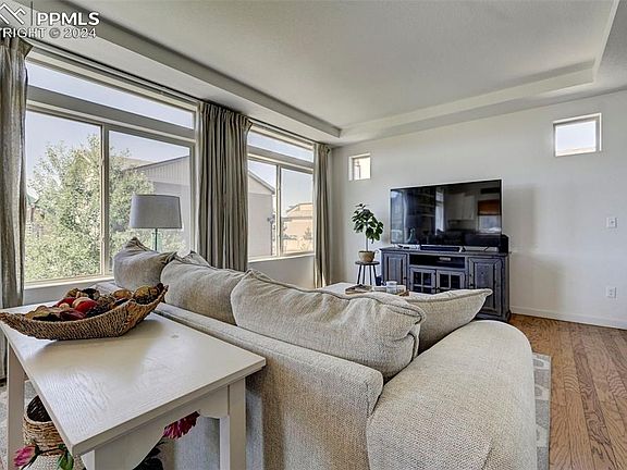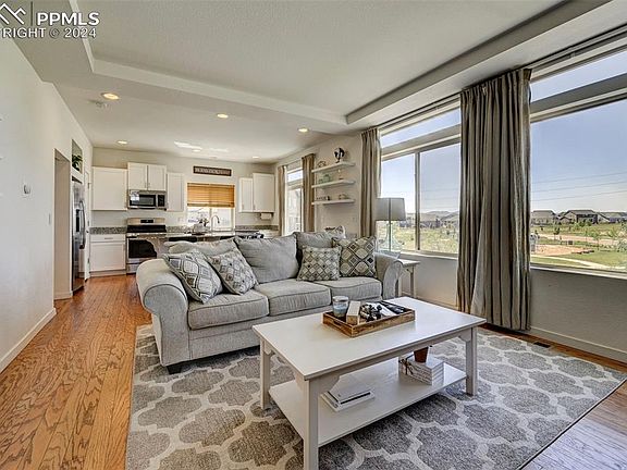Welcome to this beautiful modern 3 Story, 3 bedroom/2.5 bath home in Banning Lewis Ranch. This master planned community has it all: pools, fitness centers, tennis courts, pickleball courts, trails, parks for kids and dogs and more! This is a premiere lot with a park next door and mountain views! With this home you'll also enjoy the full 6ft privacy fencing. The open floor plan and natural light is appealing. The kitchen includes granite countertops, white kitchen cabinets, large kitchen island (no separate table needed), stainless steel appliances - including gas stove, and wood floors. There's also an attached balcony to enjoy the views. The Main floor primary bedroom has an attached bathroom & spacious walk-in closet. The Lower level features large family/recreation room with a walk out to the large concrete patio. The yard has low maintenance fencing and solar lights attached to fence panels. The upper level has an additional 2 bedrooms and a full bathroom. This is a prime location being close to the parks, community pools and recreation centers. Home is turn-key ready! For convenience, this home is located less than a 20 minute drive to Peterson AFB and Colorado Springs Airport.