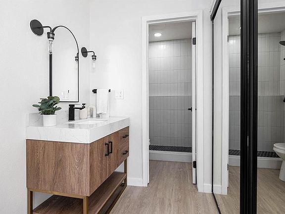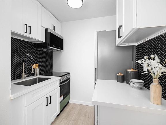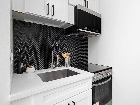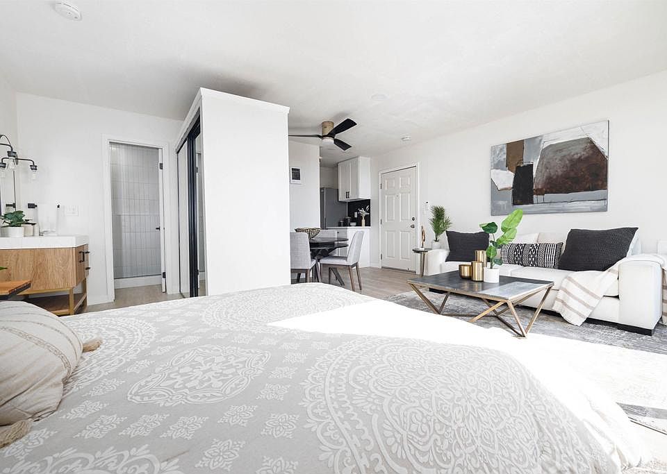 Meticulously remodeled studio in Clairemont Mesa East! Upgrades include new white shaker kitchen cabinets with black hardware and soft close hinges, black herringbone tile backsplash with grey grout in the kitchen, new quartz counters in kitchen, new kitchen faucet, new stainless steel appliances, fresh designer paint inside, new light fixtures, new mirrored closet door, new baseboards, new bathroom vanity, new toilet, upgraded shower with vertical white stack subway tile and black penny floor pan, and vinyl oak maverick flooring throughout. Close proximity to shopping, numerous restaurants, schools, and highways. Don't miss this one! Seller will entertain offers from $350,000-$369,000.