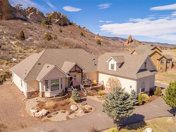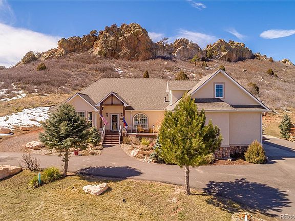 Beautiful 5 bed, 5 bath 3,425 square foot ranch home with high end finishes throughout, Australian cypress hardwood floors, and impressive views surrounding the property. True indoor/outdoor living with 20' x 35' covered deck with views of the stunning red rock outcroppings, outdoor fire place, and outdoor kitchen with slab granite. Large separate suite on the upper level with bathroom that is perfect for a guest suite, kids play room, or secluded mother-in-law suite. Impressive 5-piece master bathroom with new free standing tub, Mr. Steam steam shower, Bosch on demand water heater dedicated to the master bath, and separate energy saving gas heater. Low maintenance home with updated travertine tile entry, brand new air conditioner installed Feb 2020, newer stainless steel Kitchenaid appliances, newer driveway, and high recovery hot water heater for guests. Plentiful storage in the home including a 2,000+ sf crawl space with 8ft ceilings in the entrance. Come enjoy the outdoors with the nearby Rampart Range trail system, one of the most scenic golf courses in the county - Perry Park Country Club, and make sure to bring your toys with no HOA, a separate golf cart/toy garage in addition to the oversized 3-car garage, and it even has hookups for your RV. Idealistic combination of seclusion that comes with views and space, but still has all your modern conveniences of public water/sewer, fast Xfinity internet, 35 mins to the DTC or CO Springs, and a wonderful neighborhood that frequently gets together if you want to socialize. Make sure to see matterport walkthrough of the home and aerial video!