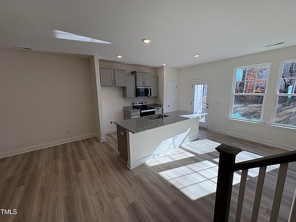The Litchfield Plan is on a WOODED PRIVATE LOT. This home is a 2-story open concept, 3 bedrooms, 2.5 bath townhome, w/ 1 car front entry garage. The spacious family room w/ 9ft ceilings opens to the kitchen w/ granite countertops & island, upgraded cabinets, SS appliances, eat in dining, & access to outdoor patio & storage. Large Owners Suite w/ walk in closet, sitting area, bathroom w/dual vanity, quartz countertops. Luxury Plank flooring throughout the main living area, all baths & laundry. Convenient to shopping, dining, & walking trails. Prime location just 15 Minutes from DT Raleigh!