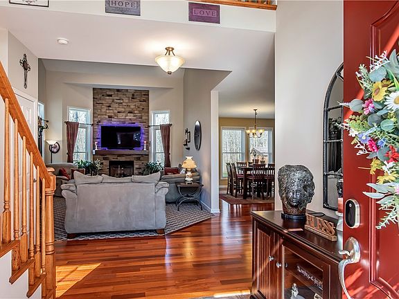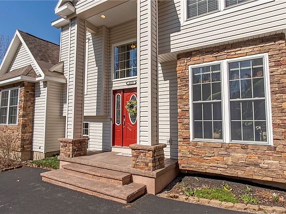 This stunning property offers a unique and tranquil living experience in a picturesque setting. Nestled on a spacious parcel of over 2.7 acres, this beautiful home boasts 4 bedrooms, 2.5 bathrooms, and over 2700 square feet of living space. A second floor bonus room offers the potential for a 5th bedroom AND a fully finished basement offers plenty of additional living space! As you enter the property, you'll be greeted by a private driveway lined with lush trees and landscaping, providing a sense of serenity and seclusion. The exterior of the home features a charming stone façade, and a 3.5 stall garage. Step inside and be captivated by the bright and open floor plan, with large windows allowing natural light to flood the living spaces. The kitchen features corian countertops, new stainless steel appliances an induction stovetop and convection with air fryer oven.The first floor primary suite offers a walk-in closet and an ensuite bathroom that features a jacuzzi bath, newly remodeled shower and double vanity. Enjoy your outdoor space with a large Trex deck, an Amish built shed and built in, interior and exterior sound system. A rare opportunity to make this home yours, don't wait!