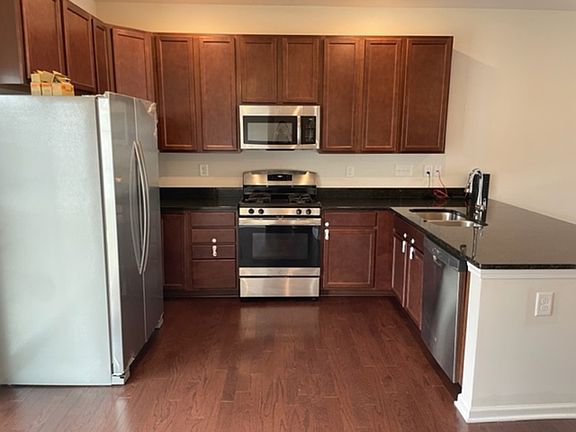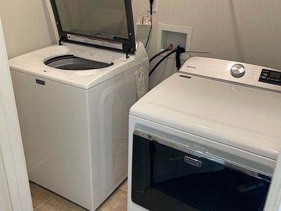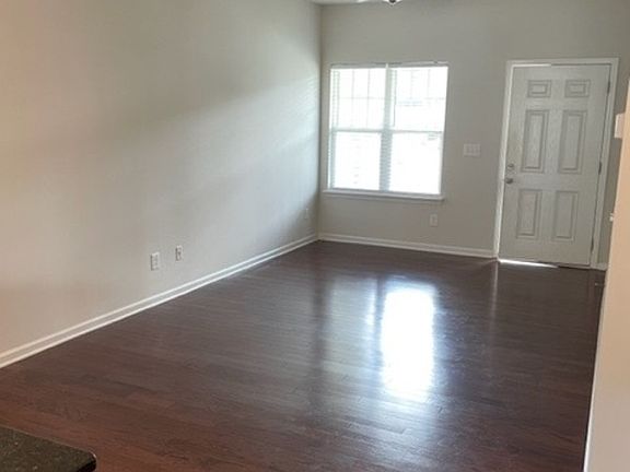 Open floor plan with laminate wood throughout first floor, attached 1 car garage. Kitchen has SS appliances, granite countertops. Laundry on first floor with washer and dryer included, half bath for convenience, raised wooden balcony out back. Upstairs the primary bedroom has walk in closet and ceiling fan, en suite bath. Two extra bedrooms share a hall bath.