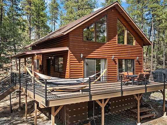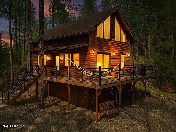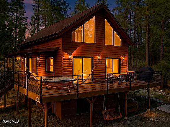 Charming Cabin Retreat nestled on 2 acres of usable land with lots of beautiful tall pines. This cabin is over 1,500+ sq. feet offering the perfect blend of privacy, comfort, and convenience. The home features an open concept living room, dining room and large kitchen with island. There are 2 bedrooms, 2 bathrooms, and a spacious loft area--ideal for guests / a potential bedroom, an office, or a game room. There is also a dedicated laundry room. Keeping you comfortable year around is a central air and heating system. Most furnishings are included making this cabin making move-in ready! This cabin is the ideal mountain retreat--whether you're seeking a full-time residence or a weekend getaway.Enjoy a new Trex deck overlooking the peaceful forest setting, along with a recently repainted exterior and a new roof. This home has had $ 49,000 in recent upgrades.The property boasts a large garage/workshop, perfect for projects, storage, or outdoor toys, and even includes a playhouse. Located only 5 minutes from paved roads, you'll have year-round access while still enjoying the seclusion of mountain living. Just 10 minutes from Lynx Lake and 25 minutes from downtown Prescott, you'll be close to both recreation and amenities.