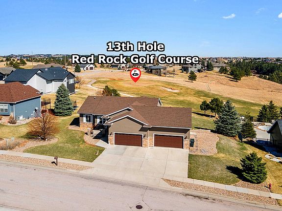 Welcome to this stunning home on the 13th hole in the prestigious Red Rock Estates where luxury living and breathtaking views come together to create a true masterpiece! From the moment you arrive, you’ll be captivated by the grandeur of this home. The open-concept living space welcomes you with warmth and elegance, featuring a beautiful double sided gas fireplace that seamlessly connects the living and dining areas—perfect for entertaining or relaxing evenings. The thoughtfully designed kitchen boasts a breakfast bar and smooth flow into the living space, creating the ideal layout. Step outside onto the covered deck off the kitchen, or enjoy the expansive main deck that opens from the dining room—both perfect for soaking in the stunning surroundings. Walkout basement featuring a cozy second fireplace, wet bar, game room, and sliding glass doors that lead to a covered patio with a tranquil waterfall feature. Two additional bedrooms and a full bath provide space for guests or family, while a large storage room with built-in shelving adds convenience. Car lovers and hobbyists will swoon over the fully finished FOUR+ car garage (1,276 sq ft!) with 12-foot ceilings and a ventless gas heater. The outdoor space is a showstopper: over 392 sq ft of Trex decking, a plumbed gas line for grilling, concrete curbing, sprinkler system, serene waterfall and pond, stylish retaining walls, and sleek cor-ten steel railing that adds the perfect modern touch.