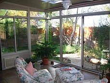 Large single level townhouse in desirable neighborhood.Appealing spacious liv area with raised beam (corbels) ceiling with kiva fireplace and brick hearth sitting area.Fabulous $25,383 Four Seasons heated/cooled sun room added 2/08.Large eat-in kitchen with added huge window to side yard/garden.Library nook/study with bookshelves was previously an atrium. Separated master bedroom. New air conditioner and furnace 5/14 with $2500 air cleaning system/humidifier/UVC. Lone Mountain pro-ply membrane roof (2012) with warranty until 5/22. Antigua Beach Quartz counters with Ethos Gray tile back splash and new sink.California closets throughout. Good curb appeal with courtyard entry. Attractive private backyard with paved path way and garden areas.Skylights have been replaced.Study can be 3rd bdrm