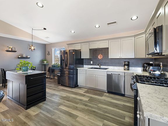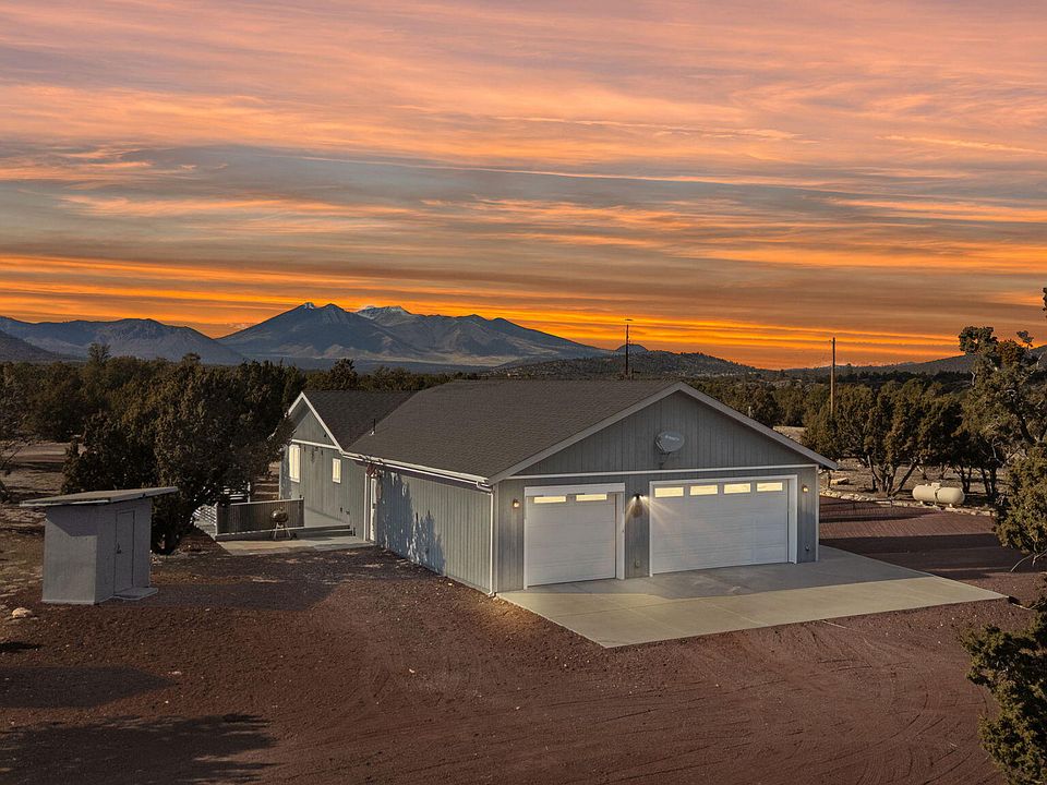 Welcome to pristine modern comfort situated on 2.5 acres directly across from the beautiful National Forest. Conveniently located near the main road and I-40, this 2019 build features two bedrooms and 2.5 baths, including en-suite with large walk-in showers in both bedrooms. Plenty of space to add a third bedroom if necessary! Cathedral ceilings and waterproof luxury vinyl plank flooring create an inviting, open living space. A wonderful and thoughtfully designed kitchen equipped with a gas stove is the heart of the home. Upgrades include energy-efficient R-108 spray foam insulation in both the home and the 33x33 oversized three-car garage, ensuring comfort year-round. The garage also offers additional space for entertaining, complete with a convenient half bath. RV pad with full hook ups Additionally, the front covered porch and side patio feature polyaspartic flooring with a transferable lifetime warranty. The property also offers ample storage with two exterior sheds and a negotiable 8x40 metal container. The possibilities are endless on your 2.5 acres with no HOA, and also zoned for animals and horses for those looking for that kind of lifestyle on the outskirts of town. Conveniently located near grocery stores, gyms, trails, theatre, mall, and dining just 10-15 minutes away. Some options include, grandmothers quarters, Airbnb, workshops, RV Garages, an ADU, etc! Experience the perfect blend of modern amenities, panoramic views, and privacyyour forest escape is ready for you!