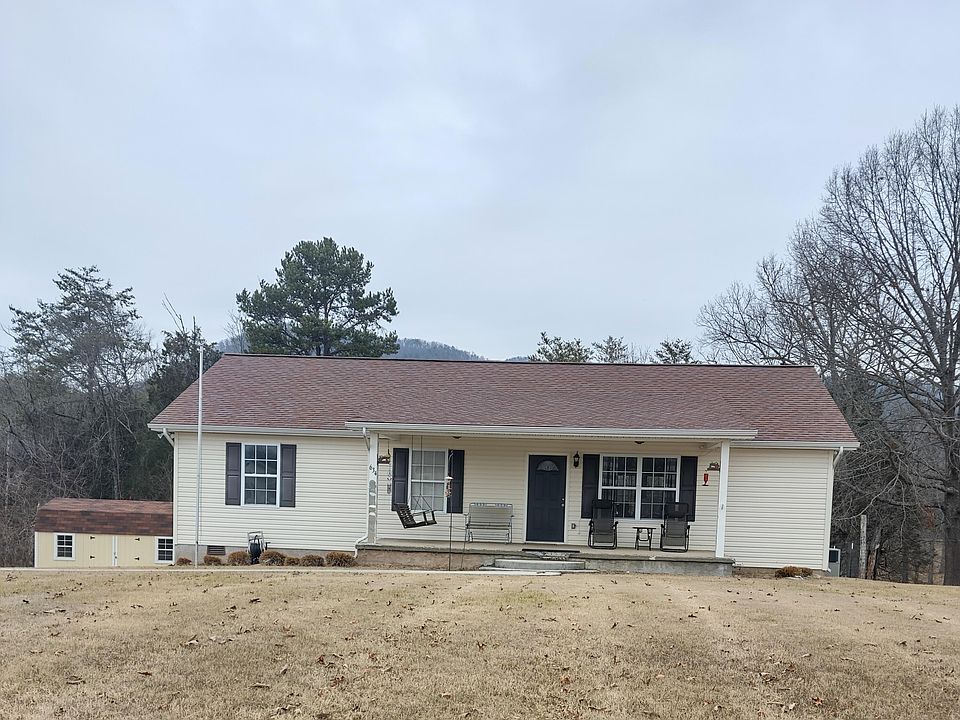 ONE LEVEL living with almost 1 acre country lot, mostly cleared, lined with trees in the back. Classic open-air front porch. Open kitchen, dining area and living room highlighted with fresh light gray paint, spacious kitchen with plenty of cabinet and appliances to remain. Laundry off dining area, beautiful laminate flooring. Enjoy a blazing cozy fire in the gas fireplace (propane gas logs). Paved driveway, NEW wood deck overlooking backyard and woods. A/C 4 years old.