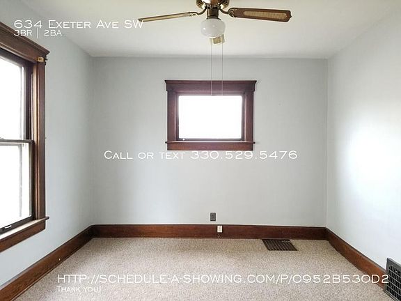 SCHEDULE A SHOWING ONLINE AT: showmojo.com/lh/0952b530d2 No No No No No Yes No No No Welcome to 634 Exeter Ave SW in Canton. This 3 bedroom 2 bathroom home is a must see. Centrally located close to Aultman Hospital, local shopping with easy access to I-77. $25 NON-REFUNDABLE application fee. Tenant pays all utilities. Deposit is the same as one months rent. NO pets allowed. 12 month lease. We do a background check for evictions and criminal history. Income must be at LEAST 3 times the rent amount in take home pay. Applicant must be able to show proof of income. Amenities First Floor *Living room *Kitchen *Dining room *Bathroom Second floor *Bathroom *Three bedrooms