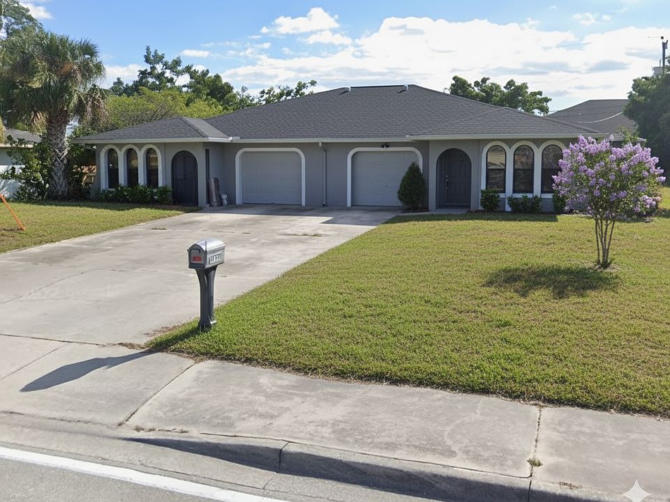 There's a large concrete driveway to an oversized garage with shelving and an automatic garage door opener for secure vehicle entry.