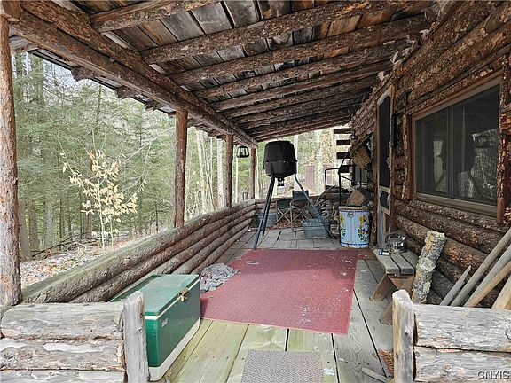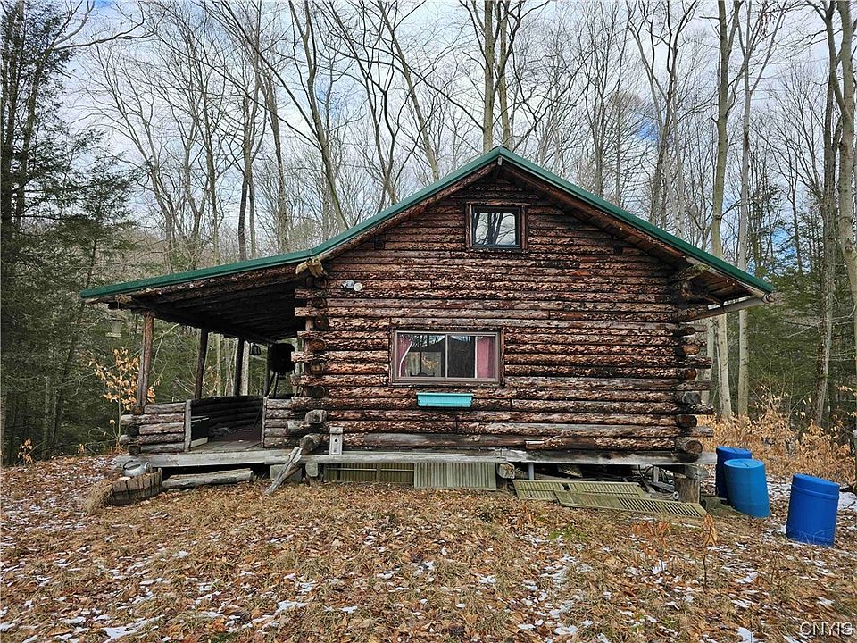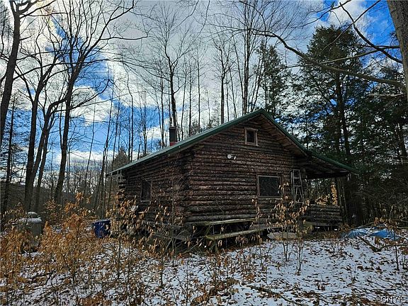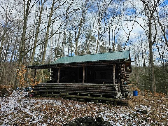 This rustic log cabin with 27 wooded acres is located in Dryden NY near Ithaca. Step back in time with this authentic rustic one room cabin located on Ringwood Road. Property offers privacy with hunting and recreational opportunities, yet it is only a 20 minute drive to Ithaca, Cornell University & Ithaca College. Furnished cabin sits back hidden from the road. The cabin includes a small wood stove, an antique gas oven, plank floors, sleeping loft, and windows for plenty of natural light. Underground 150 amp power has been run to the cabin, and there is a propane wall heater for those chilly fall nights. The landscape is rolling, and the cabin sits in an elevated level area offering privacy and tranquility. Throughout the acreage are multiple species of Oak, Hickory, Beech, Hemlock, and Maple. On the lower side of the property is a small run-off stream, and the property borders Cornell University land with potential for additional hunting land by permit only. Located in WMU 7R. Teeming with wildlife and has been used mainly for hunting whitetail deer and turkey. Several ATV trials throughout. There is an outhouse. No well or septic.