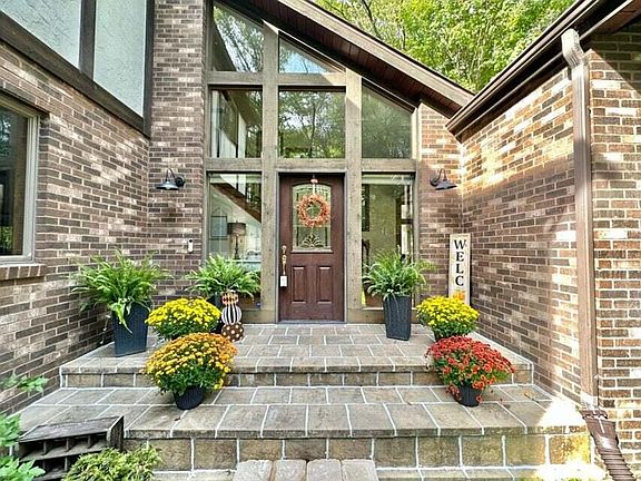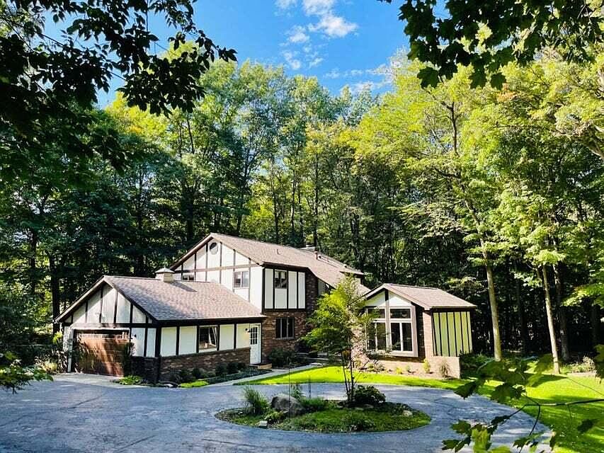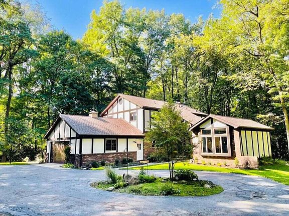Gorgeous & Breathtaking describe this beautiful Tudor style home tucked into 6.34 serene wooded acres. Watch and witness the beauty of Mother Nature from every room in this home. The interior has been tastefully updated and features an open concept kitchen that flows into the great room with beautiful brick fireplace, large formal dining room and additional living room and finished laundry room. Four Seasons room features walls of sliding glass doors and leads out to new large deck overlooking the picturesque valleys and creek. Upstairs are four large bedrooms with new carpeting and paint, large foyer with ample storage and two updated bathrooms. The basement was recently finished featuring an industrial style vibe. The acreage has all the privacy one needs with walking paths, along with an outdoor screened in building and additional garage located. Updates include new roof, two new decks, garage door, bathrooms, appliances, paint, carpeting, flooring, and gorgeous landscaping.