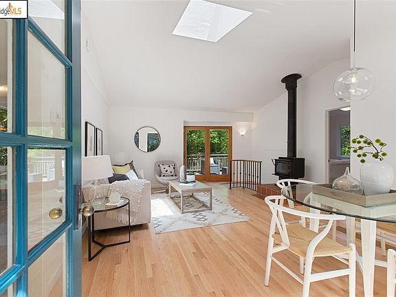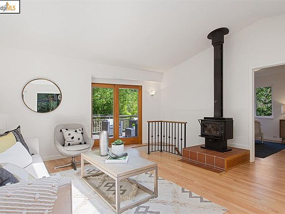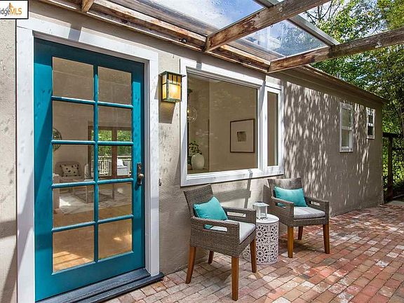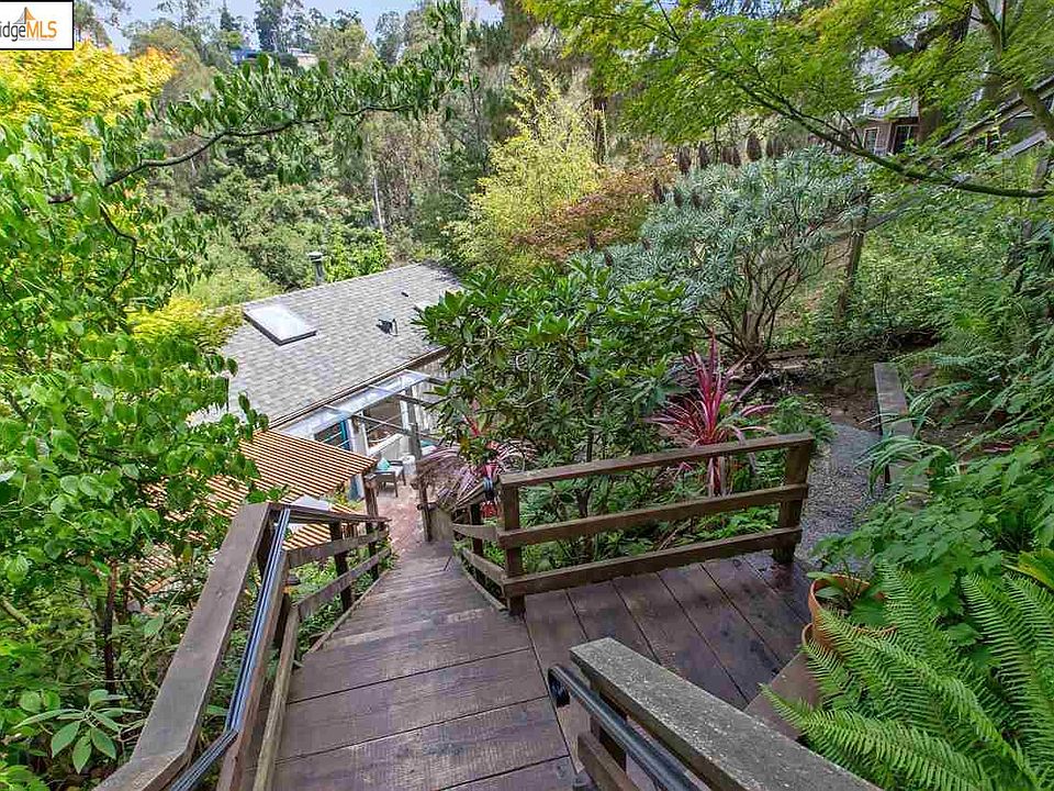 Delightful Montclair hideaway in magical garden setting. Set in a verdant glade, this enchanting cottage transports you to restful quietude. A pretty wooden stairway from the street takes you down 40 steps to the house, and is bordered with lush vegetation and hidden pathways. The front brick patio spans the length of the home, with a greenhouse tucked away at one end. Gleaming hardwood floors stretch throughout the sunny living area and out to the back deck. Look out through the treetops and across the canyon. The adjacent kitchen steps easily out to the front patio for outdoor cooking ease. The master suite sits on the main level with leafy garden vistas. The two bedrooms downstairs have direct outdoor access to a lower deck and a lower patio. Tucked throughout the grounds are numerous captivating spots, including a koi pond and a sweet gardening shed with porch in a large clearing. An ideal haven conducive to indoor-outdoor living, and proximal to Montclair Village and transit.