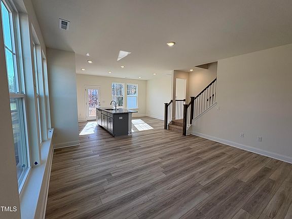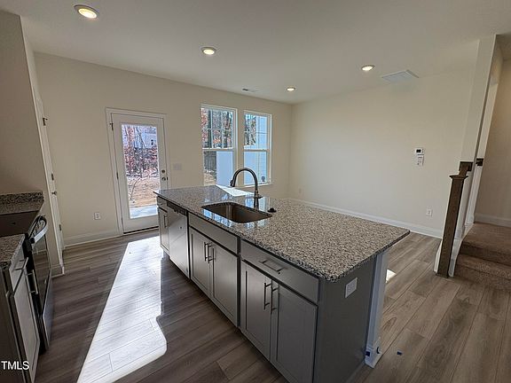 The Litchfield END UNIT is on a PRIVATE WOODED LOT! This home is a 2-story open concept, 3 bedrooms, 2.5 bath townhome, w/ 1 car garage. The spacious family room w/ 9ft ceilings opens to the kitchen w/ granite countertops & island, upgraded cabinets, SS appliances, eat in dining, & access to outdoor patio & storage. Large Owners Suite w/ walk in closet, sitting area, bathroom w/dual vanity, quartz countertops & walk in tile shower. Luxury Plank flooring throughout the main living area, all baths & laundry. Convenient to shopping, dining, & walking trails. Prime location just 15 Minutes from DT Raleigh!
