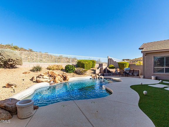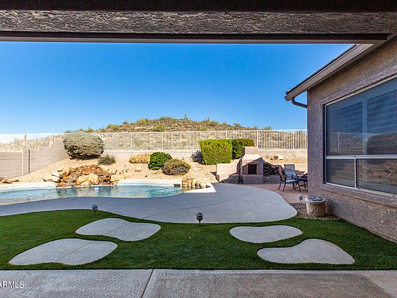 Backing to a mountain side you will find peace & privacy in this 3 bed with den property. Offering a lovely desert front yard, RV gate, & 3-car garage w/attached cabinets. Walk in to the living/dining room, with vaulted ceilings, tile/wood flooring, & plantation shutters. Open layout is filled w/bountiful natural light, a media niche, & a breakfast nook w/a bay window. The kitchen is a cook's delight fully equipped w/ Corian counters, gas range, large refrigerator & an island w/a breakfast bar. Primary retreat has a double-door entry, a sitting area, a full bathroom, a walk-in closet, & backyard access. The fabulous backyard invites you to relax & have fun! It provides a covered patio, an exterior fireplace, a built-in BBQ, & a crystal blue pool with rock waterfall.