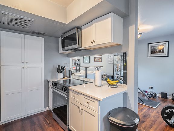 Sleek quartz countertopsRenovated kitchenModern recessed lightingSurrounded by mature treesLush landscapingCharming condoTwo closets