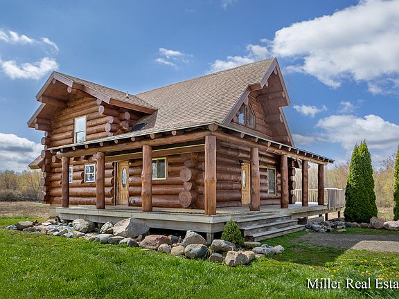 Very possibly Bellevue's Biggest Bucks live on this property!! Numerous videos & photographs available showing multiple & massive bucks in the food plots of this log home on 38 +/- Acres. This 4 bedroom 2 1/2 bath log home is ready for your finishing touches. Many repairs & updates have been done in the last 10 years with others yet to be completed. The kitchen has tile floor with a rolling island. Living room has slider to deck offering a spectacular views of the food plots, woods & pond area. The main floor also has a primary en suite with deck access. 2nd floor has 2 bedrooms & a 2nd full bath. The walk-out lower level offers recreation room, 1/2 bath & 4th bedroom. 36x74 Pole barn has a lean to as well as a heated office/tack room. Every outdoor persons dream!