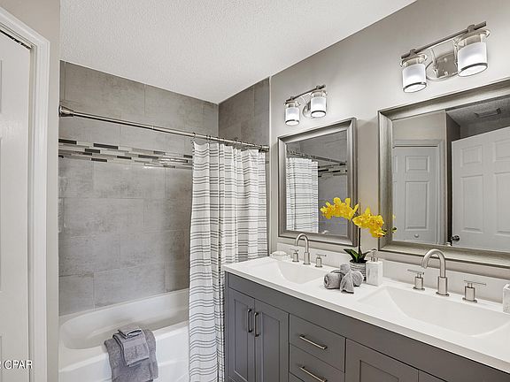 Absolutely ADORBS! MUST see, completely renovated in 2020. Split floor plan, vaulted ceilings in the living room, and primary bedroom. Kitchen outfitted with stainless steel appliances, quartz countertops, tile backsplash, breakfast bar and French doors to the fenced deck for BBQ get togethers. This home offers 3-bedrooms with LVP floorings and 2 full baths with tile and marble top vanities with double sinks. The one car garage is oversized with laundry area and space for storage. Backyard is fully fenced for privacy and has no neighbors directly behind the lot. Sweetwater Village is only a 20-minute drive to Tyndall and Downtown Panama City. All information is deemed correct, buyers should verify if important.