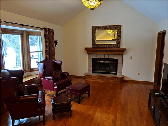 This ranch home on 3 acres features 3 bedrooms, 2 bathrooms, 2 car garage w/ additional 3rd car/utility garage, & a pond. You're welcomed into this home w/ wood floors, vaulted ceiling & wood burning fireplace in the living room. The dining area continues the wood floors & walks out to a deck. The master suite has vaulted ceiling, ceiling fan & new carpet. The unfinished basement has plenty of room for storing lawn mowers, a boat, etc. & has an additional non-conforming room w/ carpet and cedar walls.