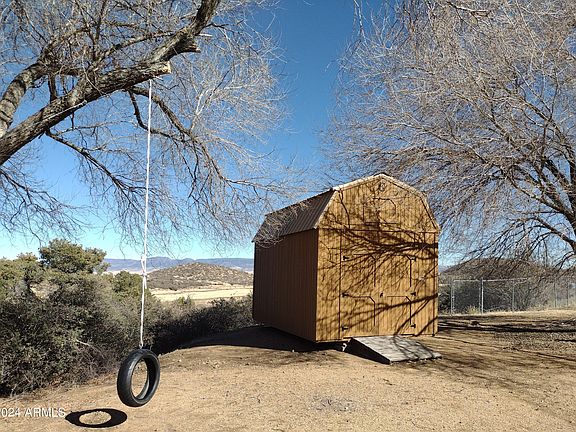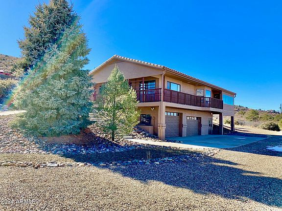 Dreaming about country living? This private property has it all! 3+ acres with panoramic mountain views, RV parking, treehouse, 2 sheds, chicken coop, doghouse, wood deck & 2500 SF of living space. No HOA. Zoned for horses, sheep, chickens, & more. Double garage with workshop and oversize entry door. RV hookups, cement parking pad and basketball court. Residence includes guest quarters (MIL suite) spacious kitchen, cast iron wood burning fireplace, split master floorplan. Den off great room could be used as DR w/deck access. Stairway to laundry & bath leads to walk out basement for back yard & garage access. Bonus is mountainside living just minutes from Trader Joe's, Costco, Gateway Mall & downtown Prescott. See it now, this one will sell fast!