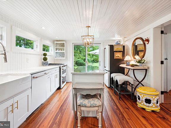 This beautifully renovated 1890 cottage is located in the quiet waterfront village of Neavitt, just a stone's throw from the hubbub of St Michaels’ restaurants and shops. The charming house has been reimagined with all the qualities of a classic summer cottage, yet features luxuries one would expect in a fine city home. Throughout the first floor, traditional white painted shiplap walls and ceilings compliment the dark wide plank floors, set off by floor-to-ceiling plantation shutters. The living room possesses a simple formality appropriate to the setting. On one side it opens to a lovely first floor bedroom or study; on the other side, tucked away from the street behind tall hedges and hydrangeas is an intimate glassed garden room. Fitted with new high-end appliances, the renovated kitchen extends the feeling of openness. Upstairs, two bedrooms and a bath abut a generously sized roof deck that overlooks the gardens. Outdoors, a heated pump house offers multiple uses, while a smaller tool shed is tucked at the rear of the garden. Gorgeous hardscaping, trellised roses, and colorful gardens surround this dwelling, offering a unique private getaway that soothes the soul. A must see!