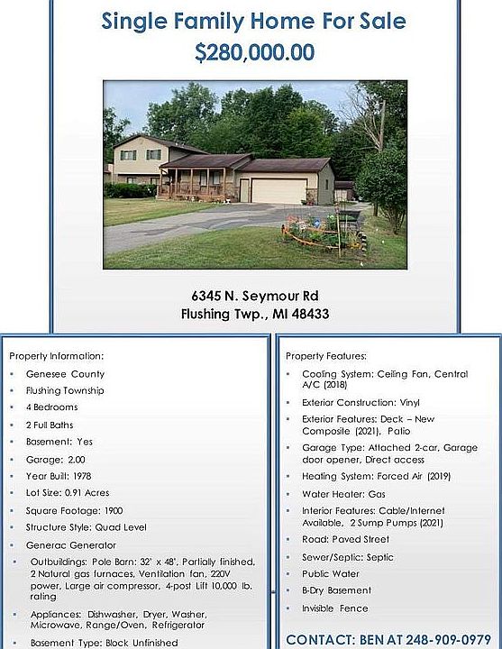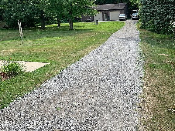 Sitting on nearly an acre, with large pole barn, 4 bedrooms, 2 bathrooms, and 3 living spaces, there's room for everyone to make themselves comfortable in this home! Unlike a traditional quad-level, all of your living area is completely above ground, with access to the back yard from the main level and the family room level. Upstairs, the 3 bedrooms all have large, walk-in closets and the full bathroom has a fantastic linen closet! The main level features your living room, dining area, laundry room/breezeway, and the spacious kitchen with ample cabinet space and a large pantry with lazy-susan shelves. On the lower level, the family room area is perfect for lounging, a game area, or even set up a desk to work from home. Also on this level, there's a fourth bedroom, full bathroom with shower stall, and possibly your favorite room of the whole house, the sitting room overlooking the park-like yard and the patio area. The basement is unfinished, with room for storage, plus easy access to the furnace and other utilities. Park in the attached garage with covered, built-in storage, natural gas wall furnace, and water hook-up. Do your tinkering in the finished portion of the 32x48 pole barn with 2 natural gas furnaces (wall and suspended), ventilation fan, 220V power, water, large air compressor, and 4-post lift rated for 10,000 lbs. The unfinished side of the pole barn has a gravel floor, overhead and sliding doors, and 12 ft ceilings. The current owners have added a B-dry basement waterproofing system (2022), furnace (2019), A/C (2018), sump pumps (2021), composite deck (2021), 30+ cubic yards of gravel, and the invisible fence for the dogs. The house also comes equipped with a whole-house Generac generator! On top of all this, the seller is including a one year home warranty! Immediate Occupancy! You have to see this one to appreciate everything it offers!
