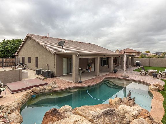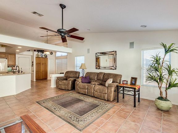 Great 3 bedroom, 2 bath home with pool and 3 car garage. Iniviting entrance with vaulted ceilings and beams. Separate living and family rooms. Formal dining. Kitchen features Corian countertops, tile backsplash, and double oven and eat-in kitchen. Large master bedroom with walk-in closet, and exit to patio area. Master bath features dual sinks, separate shower and garden tub. Home is shown as a 3 bedroom, builder took bedrooms 3 & 4 and made 1 extra large bedroom, can easily be converted. Entertaining backyard with extended covered patio, synthetic grass, sparkling pool, in-ground hot tub, and mountain views. RV gate with large concrete pad for toys.