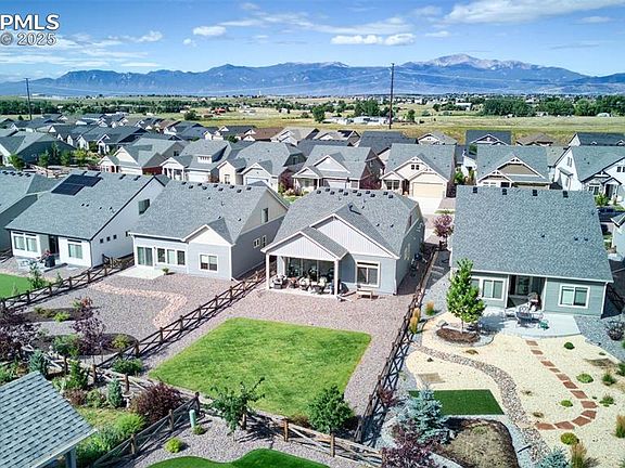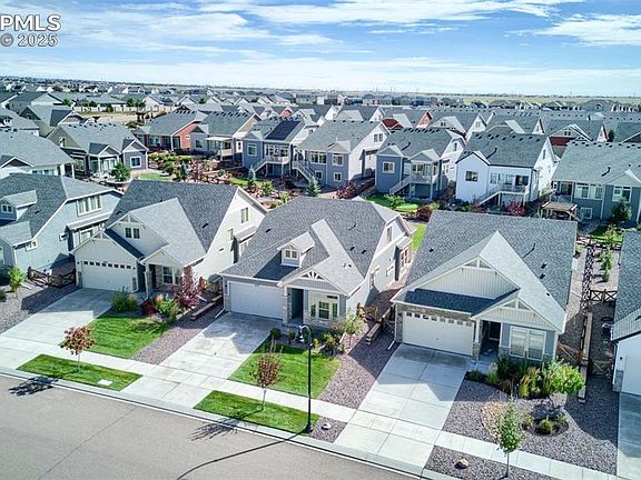 Welcome to this spectacular home in coveted Banning Lewis Ranch! This stunning home features beautiful upgrades, including a statement tiled fireplace and Colorado room sliding glass door with custom shade blinds, quartz counters, tall ceilings and doors, beautiful light fixtures, and pretty kitchen backsplash. The inviting open floorplan between the kitchen, dining, and living rooms allows you to share quality time with loved ones. Enjoy crafting meals with the large island, gas stove top, stainless-steel appliances, and spacious pantry. Step out to the covered back patio and enjoy space to grill, garden, or relax in the impeccably landscaped backyard. The ceiling fan and extra shade helps keep you cool as you enjoy the outdoors. The spacious main-level primary suite features an ensuite bathroom with double vanity, spacious zero-entry shower, and walk-in closet that make getting ready a breeze. The main level boasts an additional bedroom, full bathroom, laundry room, and generous storage space, creating true main-level living. Head upstairs to the loft, which provides endless options for a family room, gym, office, and more. The upper level features an additional full bathroom and bedroom with a spacious walk-in closet, perfect for your guests to have some privacy. Enjoy all of the amenities this 55+ gated community has to offer, from the community center, trails, pool, pickleball courts, bocce ball, and more. Don’t miss your chance to experience living in Banning Lewis Ranch- schedule your showing to see this gorgeous home today!