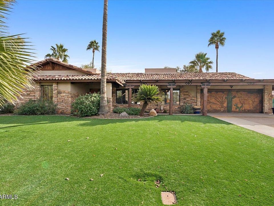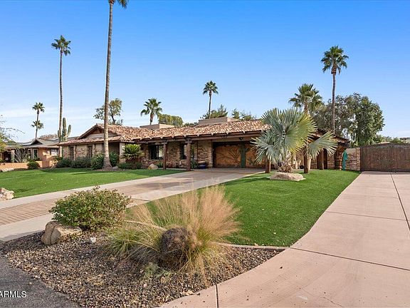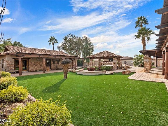 This custom-tailored home situated on 1/2 acre lot offers exquisite quality features such as hardwood & tile flooring, custom wood cabinetry & doors and stacked stone fireplace. A formal living room & dining area accent the entry of the home. A more casual family room w/fireplace is located off the kitchen & breakfast nook. The master suite has access to the backyard & offers a large walk-in closet. 3 secondary bedrooms round out the guest space in the main home. In addition to the attached 2-car garage, the property offers an additional oversized 2+car garage with workshop/home gym area & large guest house w/gated private driveway. The backyard offers a Pebble Tec pool w/water & fire features, gazebo area for outdoor dining, spa, artificial turf & additional patio seating. Enjoy outdoor dining under the gazebo w/walk-up bar. The front yard and backyard have low maintenance turf and mature landscaping with palm trees making it a true desert oasis!