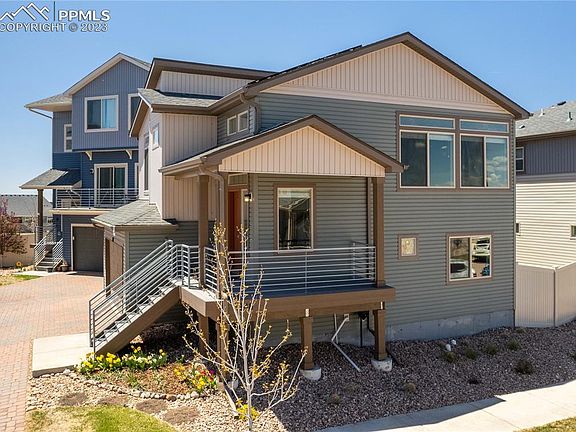 This two bedroom, two bathroom Carriage House in Banning Lewis Ranch offers a two car garage, fully landscaped and fenced backyard, and solar panels that convey with the property. With 9 foot ceilings throughout the main level, a gas range, refrigerator, dishwasher, and large eat-in island with stone countertops, the kitchen is perfect for entertaining. The primary bedroom includes a walk-in closet and adjoining bathroom with a spa shower, while the garage has a bonus built-in, drop-down lifestyle screen. Situated near parks, trails, and schools, this property is a must-see for those looking for an eco-friendly and modern home in a desirable community.