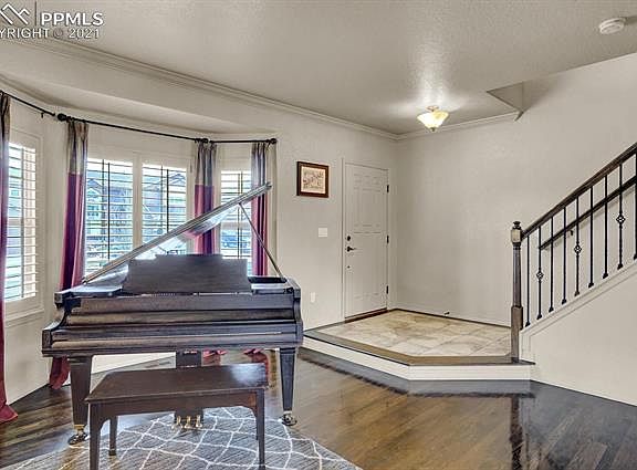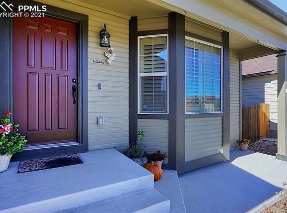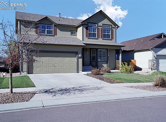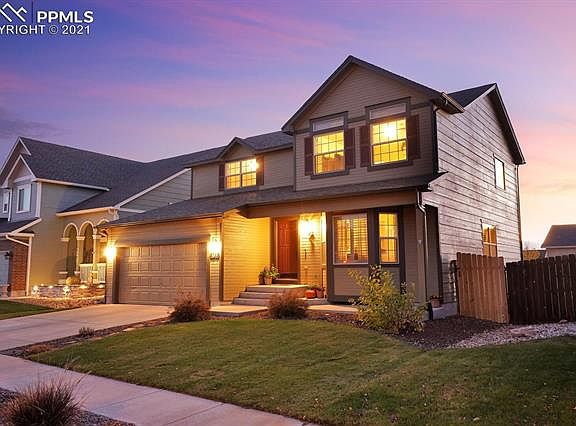 Inviting 5 Bedroom, 4 Bath home with fabulous Pikes Peak views and Central Air! Covered front porch to enjoy the Colorado sunshine. Open floor plan with engineered hardwood floors through the Living Rm, Dining Rm, & Kitchen. Plantation shutters & oil rubbed bronze hardware. The Front Entry has a tile floor with wood trim, iron rails to the upper level, & leads into the Formal Living Rm. The Dining Rm has a tray ceiling & an attractive light fixture. The walkout Kitchen features cabinets with roll-out shelving, granite countertops, a glass tile backsplash, & appliance storage. There is also a large counter bar with pendant lights, & walk-in pantry. Stainless-steel appliances include a dishwasher, smooth-top range oven, & new built-in microwave. A new Renewal by Anderson slider door takes you to the composite deck with gorgeous Peak views. The main level Family Rm is wired for speakers and offers a gas log fireplace with stone surround. Convenient main-level Powder Bathroom & Laundry Rm with window, cabinet, & shelves. The upper-level vaulted Master Bedroom has French doors into an attached 5pc Bathroom with tile flooring, a raised, dual sink vanity, tiled tub/shower, & cedar lined walk-in closet. Bedroom #2 (currently a Craft Rm) has double closets & Peak views. Full Hall Bathroom. Vaulted Bedroom #3 has wood laminate floors & a walk-in closet. Bedroom #4 (currently an office) offers a walk-in closet & Peak view. The finished walk-out Basement has a large Rec Room, Bedroom #5 with an enormous walk-in closet, and bath. The Rec Rm has a wet bar & walks out to a covered patio with picnic table for outdoor fun. Fenced, level lot with auto sprinklers & storage shed for tools & toys. Additional features include: New A/C & furnace, humidifier, linen closet, lighted ceiling fans in all bedrooms, Class IV Shingles, and Newer exterior paint. Located near the Powers Corridor for restaurants, entertainment, & shopping. Easy commute to Peterson AFB.