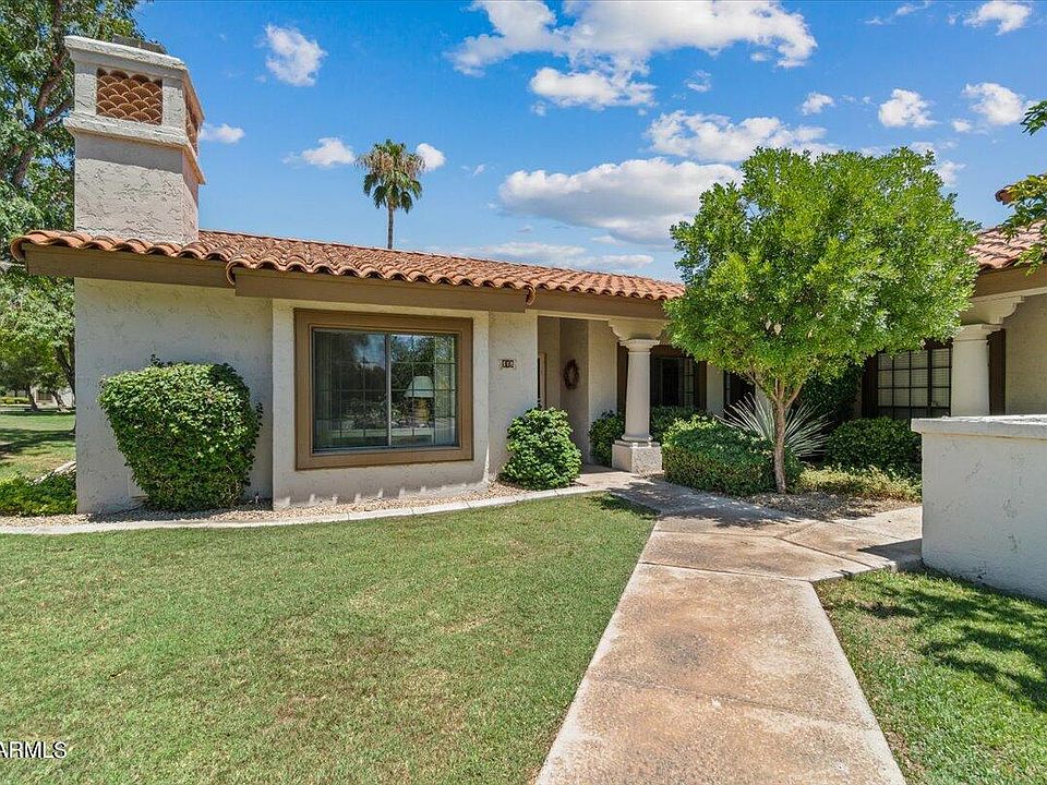 Cool 2 bedroom, 2 bath with split master bedroom and 2 car garage. YOU CAN DO AirBNB! Totally furnished for AirBNB and all personal property you'd need can convey gratis! This sought-after Scottsdale community of Arroyo Verde is right on the Silverado Golf Course and also on the 25 mile long Scottsdale greenbelt walking/biking' path goes thru Arroyo Verde! Get some exercise! Home has old world clay tile mudded roof and masonry construction. Block walls-SOLID & QUIET! Arroyo Verde is a lush green area - Grounds always meticulously manicured. Tree lined streets. Washer, Dryer & Fridge stay with home. 2.5 miles to Fashion Square or Talking Stick or Dbacks/Rockies. Free trolley to old town. ONE STORY-NO STEPS! Come & Get it!