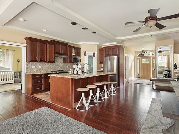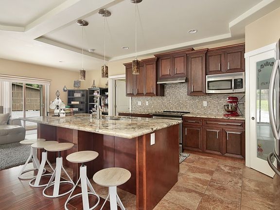 Nestled in a clearing among the foothills, find your personal oasis in a spacious 2010 custom home. Cozy up to the airtight wood stove, and enjoy cooking dinner in the modern kitchen with granite countertops, glass pendant lighting, walk-in pantry, and stainless steel appliances. Master on the main; jetted tub in ensuite bath and finished 4th room. Living area opens to custom poured concrete patio - plenty of space for outdoor relaxation! Outbuildings to house lawn & recreational equipment.