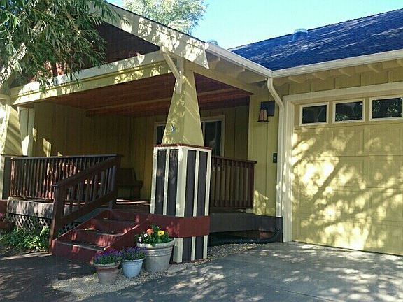 Craftsman/Bungalow- single level - open floor plan - white vinyl windows - stained concrete interior floors - 100% wool carpet in bedrooms - several solar-tubes and skylights through-out - ladder to a 240 sqft bonus room - large attic over garage for storage with electrcity and shelving - Master has walk-in closet, soaking tub and (2) shower heads - all other bedrooms have mirrored closet doors - Zero VOC paint used inside and out - Main living area has a full T & G ceiling with ceiling fan - ceiling is vaulted with about 16" at peak - I just installed all new LED lights, so they won't need to be changed for about 10 years. Large Wood Front Porch with T & G Pine ceiling Fenced, Pebbledash Back Patio with Large Permanant Dog House, Built-In Planters with Bench and area for BBQ Side Yard is Landscaped with Flagstone Walkways and Flagstone Patios House is on a "cut de sac" of sorts - so no through traffic Fully fenced compost area Raised garden with only organic soil and fertilizers used and irrigated South Side is full concrete for "toy" storage - boat, jet ski's etc. Air Conditioner works great if you need it House has never been smoked in - so it doesn't smell weird.