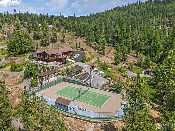 Welcome to your private resort in the woods. This custom home sits on a south facing hillside and is surrounded by mountain views from every angle. Main floor includes great room with kitchen, dining areas and living room, as well as the primary suite, laundry room, powder room and mud room. The finished daylight basement has access to a covered patio, large family room with wood stove, 2 office/bedrooms directly off it, with 2 more bedrooms, mechanical room and cold storage room. Outside is a mature landscape with multiple garden and seating areas, oversize tennis/sport court with stadium lights, outdoor sauna, hot tub, and play cabin on the lawn. Nearby is a 30X60" insulated heated shop, with storage and 30X30" rec room upstairs.